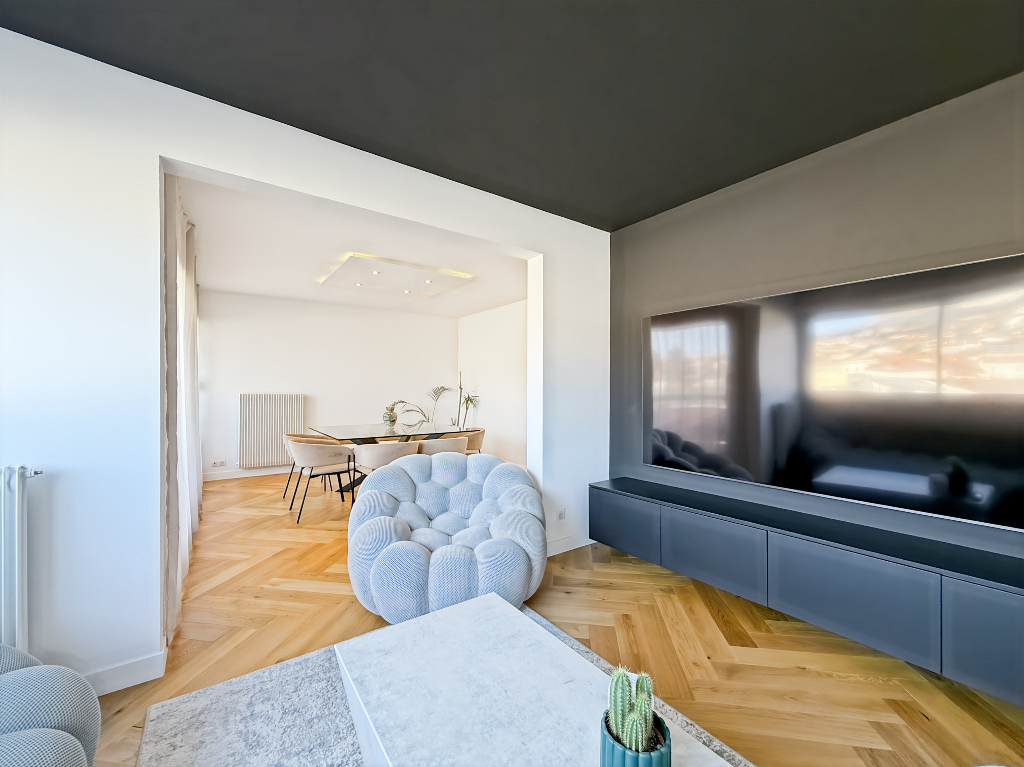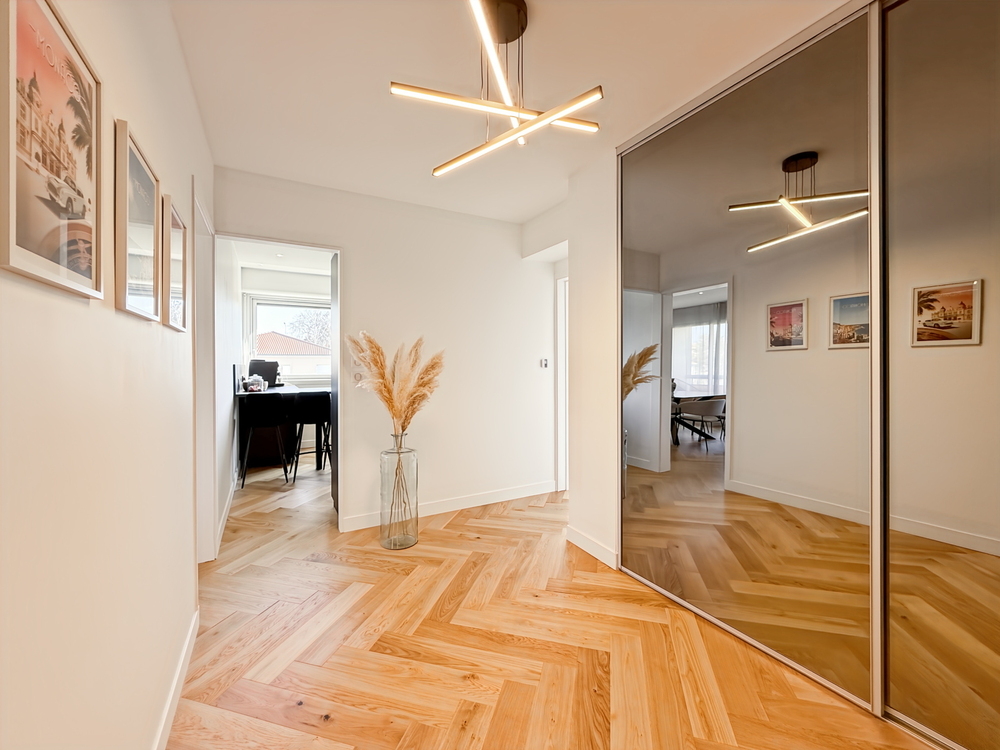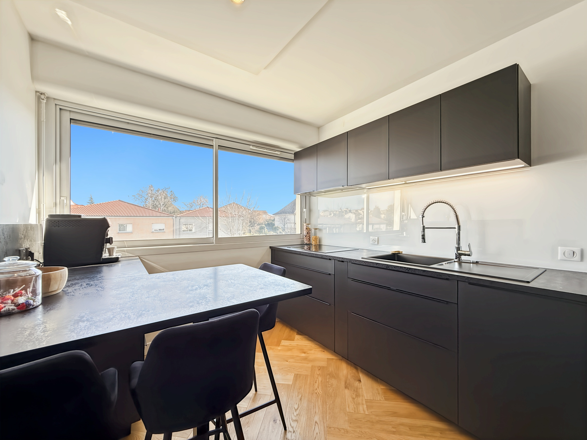 Dès l’entrée, l’ambiance est moderne et soignée, avec de belles finitions et une circulation fluide. La pièce de vie est lumineuse et chaleureuse, mise en valeur par des espaces parfaitement pensés : salon cosy, espace repas élégant, et de grandes ouvertures qui apportent une vraie sensation d’espace.