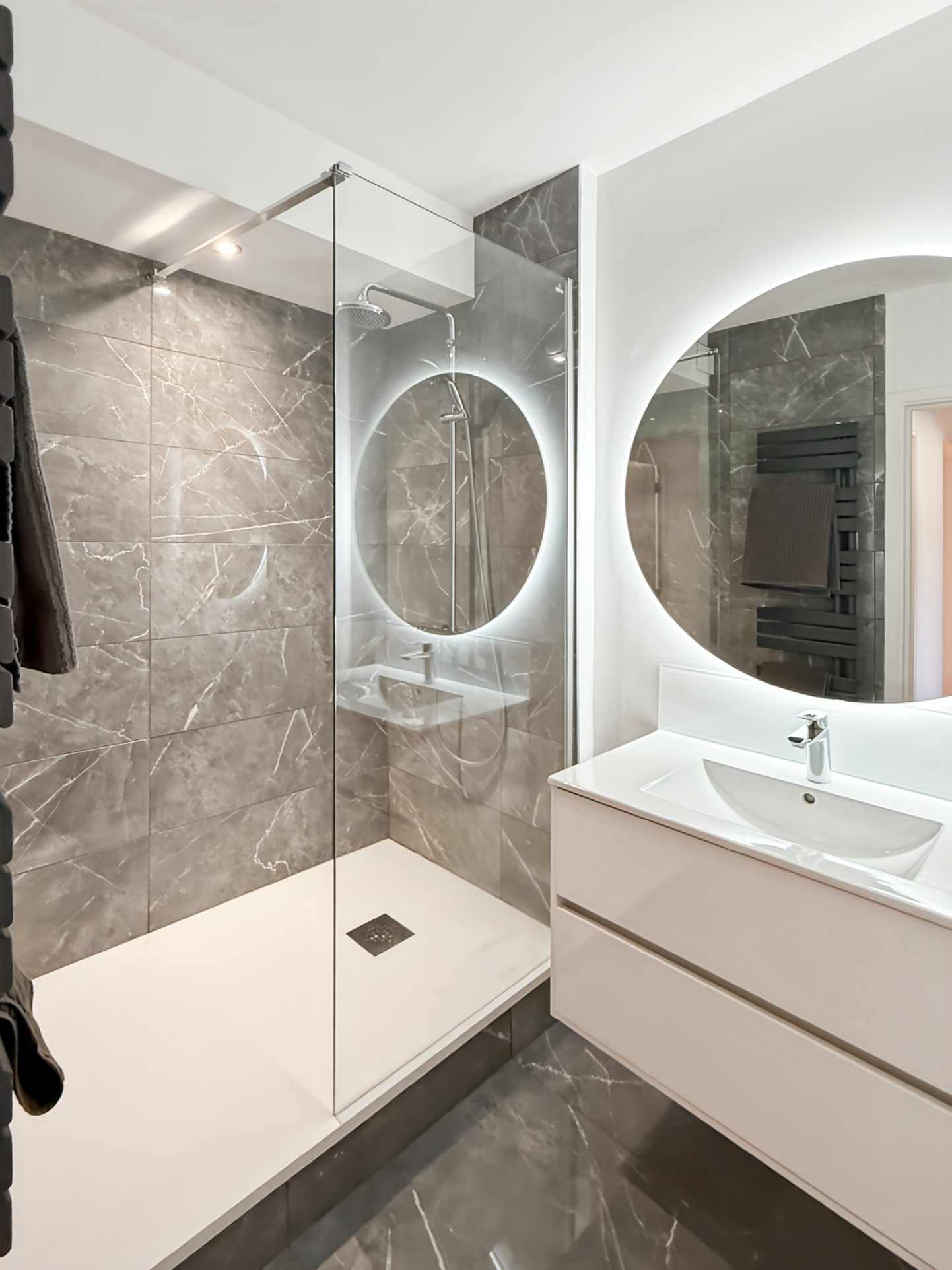 Salle d’eau moderne avec douche à l’italienne et miroir rétroéclairé