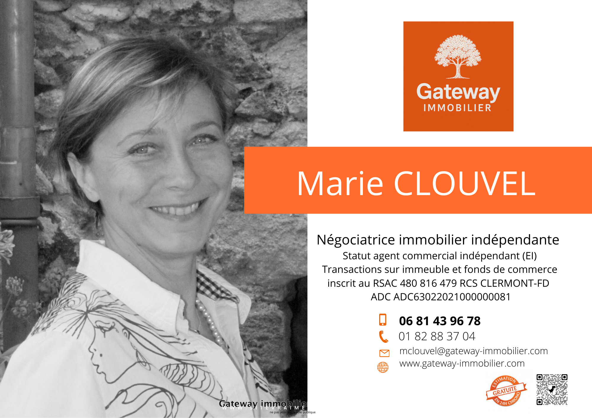 La présente annonce a été rédigée sous la responsabilité éditoriale de Marie CLOUVEL (E.I) consultante immobilier indépendante inscrite au registre spécial des agent commerciaux indépendant sous le no RSAC 480 816 479, titulaire de la carte de collaborateur No ADC 6302 2021 000 000 081 pour le compte de la SAS GATEWAY Immobilier Siret 537 849 093. Cette annonce vous est proposée par Gateway immobilier, Réseau national immobilier, au capital de 2 000EUR, Carte professionnelle T no CPI 6302 2018 000 024 143 CCI du Puy-de-Dôme.